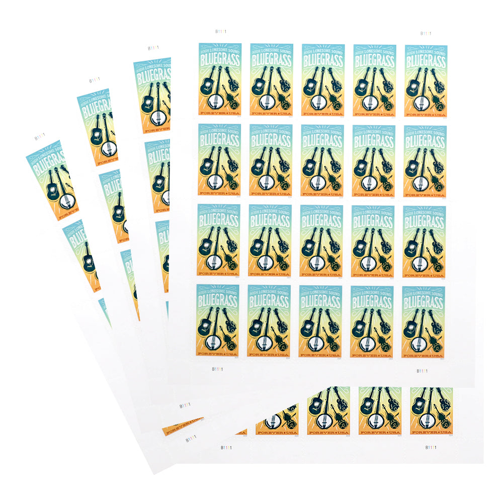 Inspired by vintage bluegrass concert posters, the stamp art features four acoustic string instruments typical of bluegrass bands: guitar, five-string banjo, fiddle, and mandolin. Text at the top of the stamp reads High Lonesome Sound, the title of a 1963 documentary about Appalachian folk music and a familiar nickname for bluegrass.