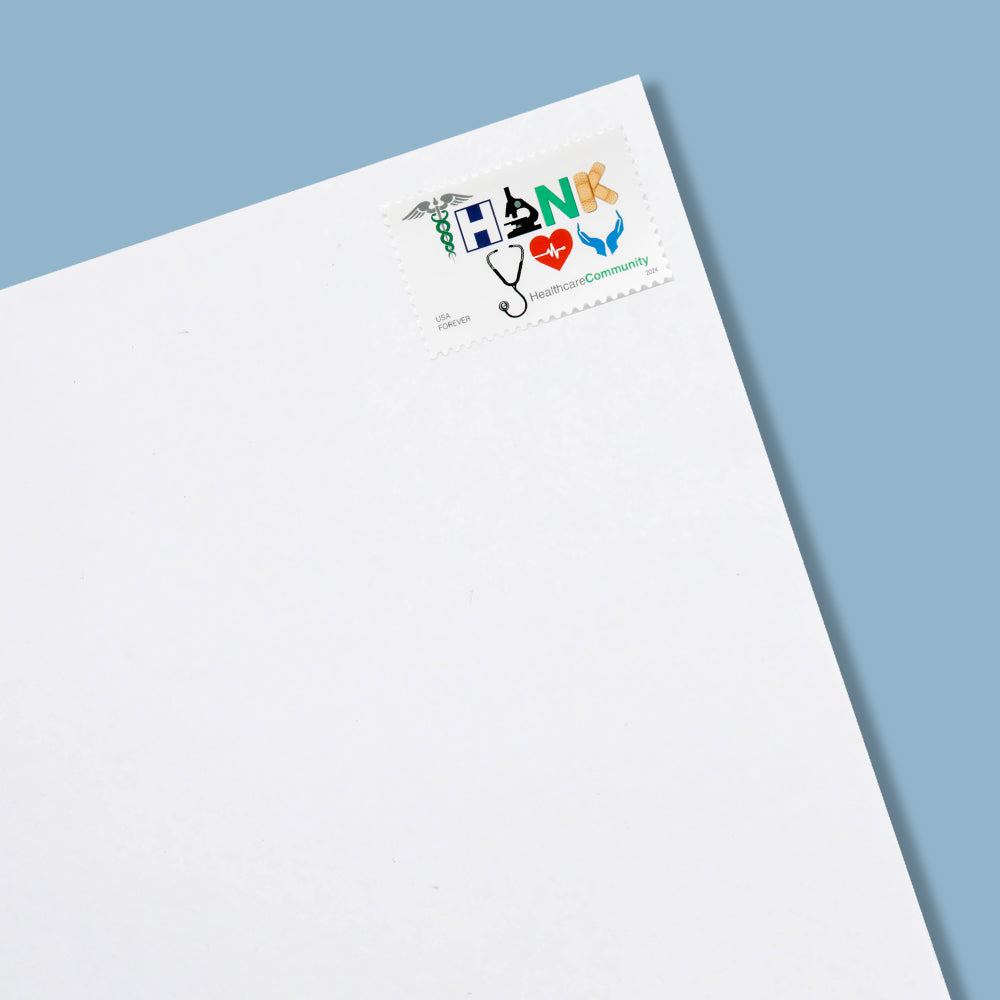 The Thank You, Healthcare Community stamp is being issued as a Forever stamp in a pane of 20. This Forever stamp is always equal in value to the current First-Class Mail one-ounce price.